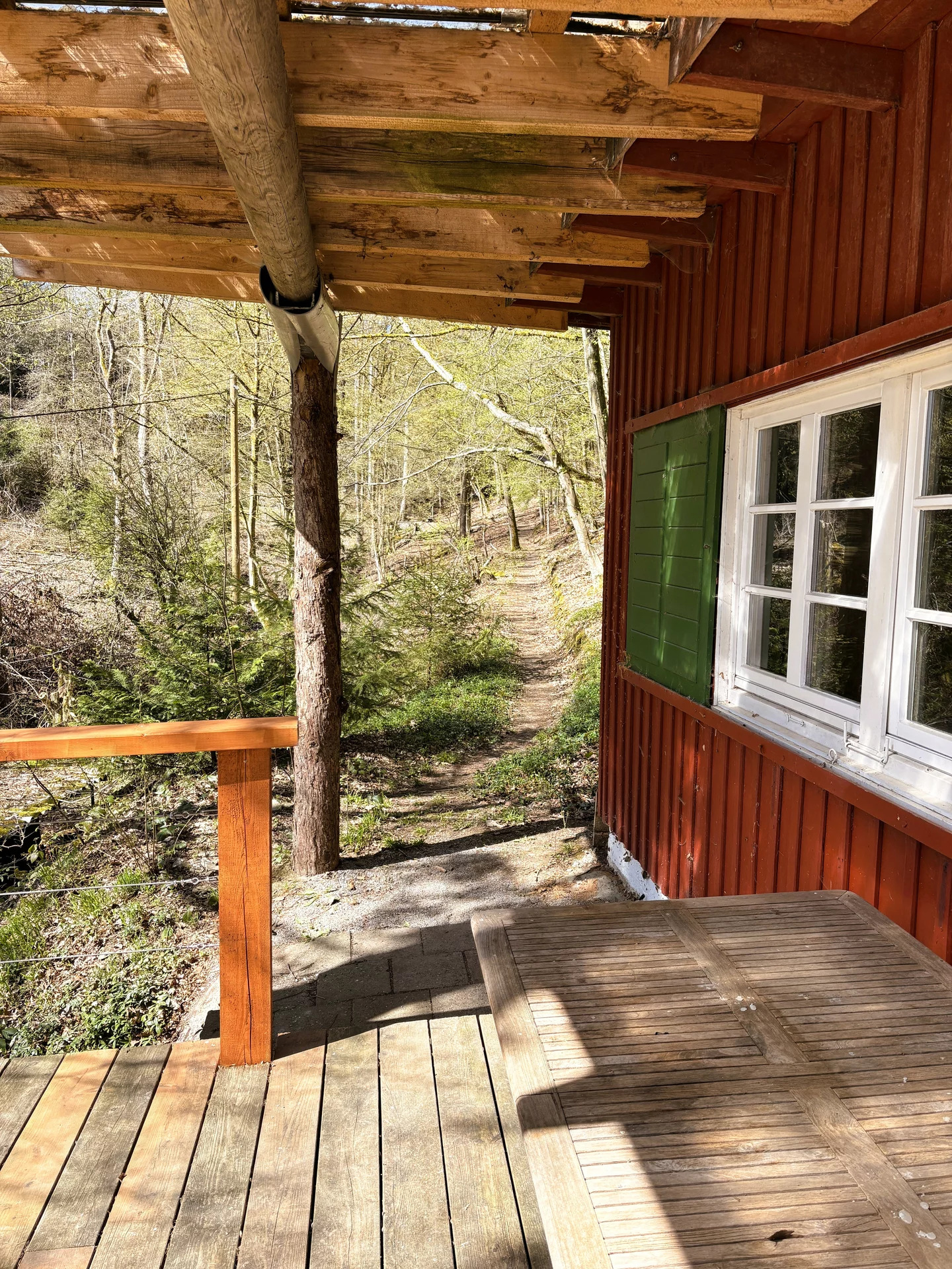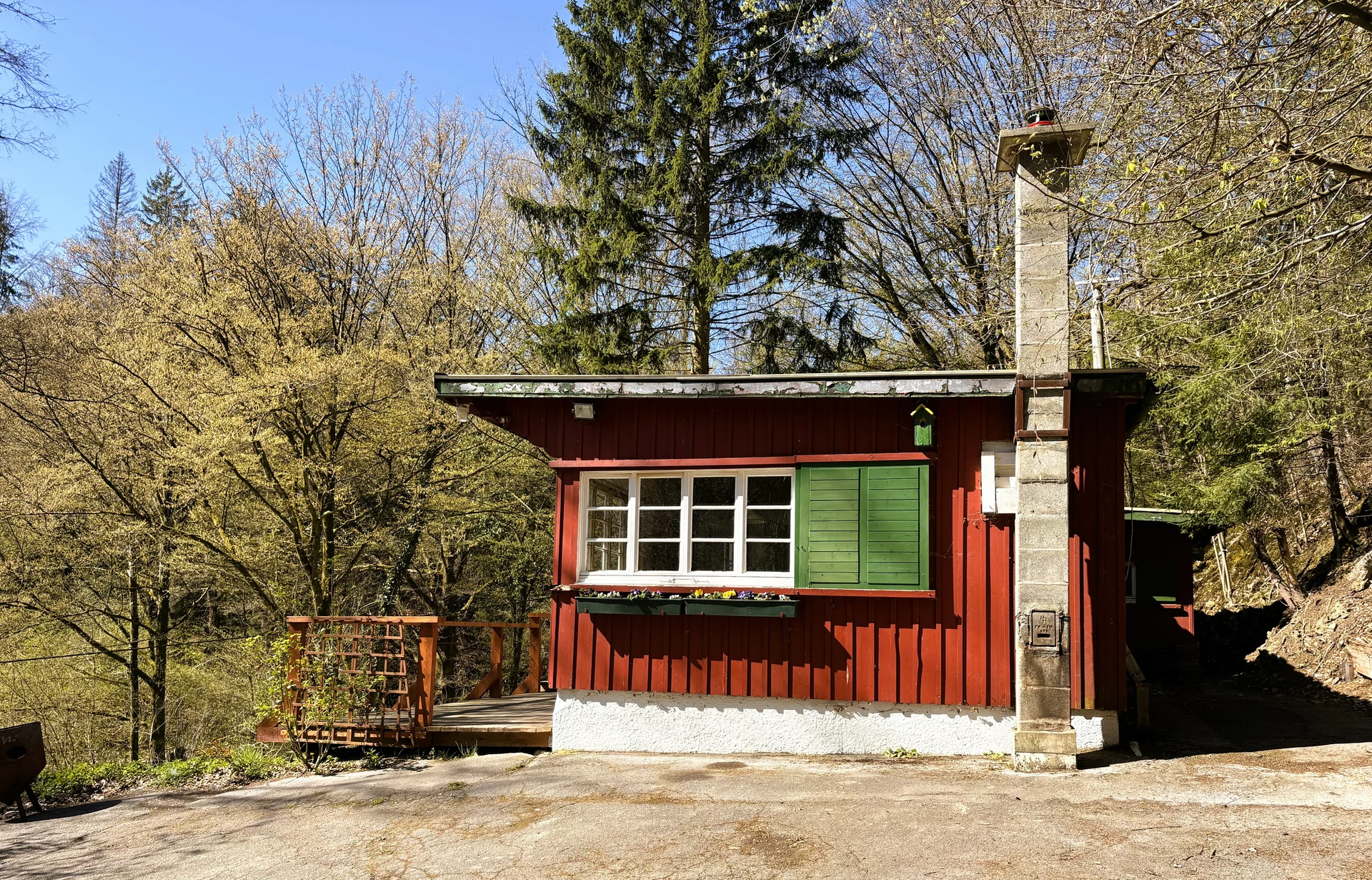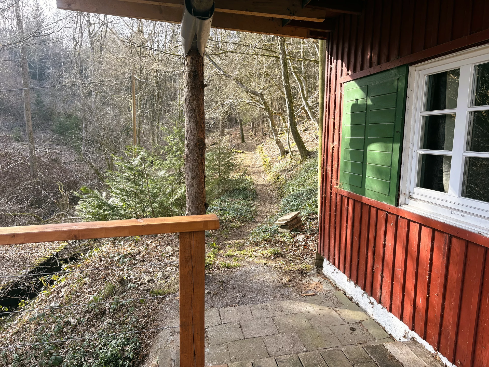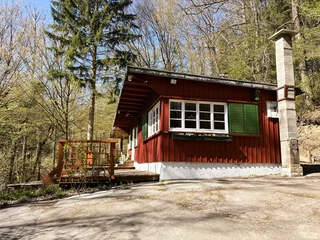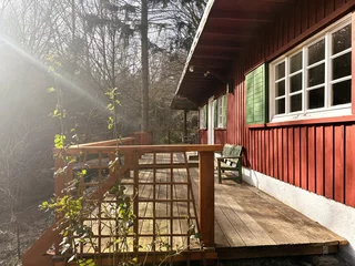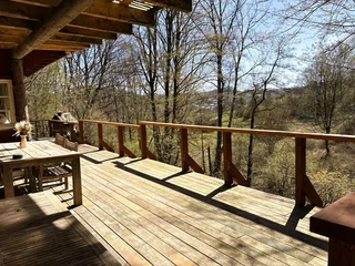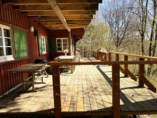Der weitläufige Außenbereich bietet neben einem Wäldchen als Gartenfläche eine großflächige Holzterrasse mit Sitzgelegenheit und ausreichend Platz zum Grillen. Über das Grundstück fließt ein Bach mit einem kleinen Teich. Das Grundstück ist mit normalen PKW erreichbar (Zufahrt über einen Waldweg, keine tiefergelegten Sportwagen) und ihr könnt direkt an der Hütte parken.