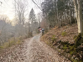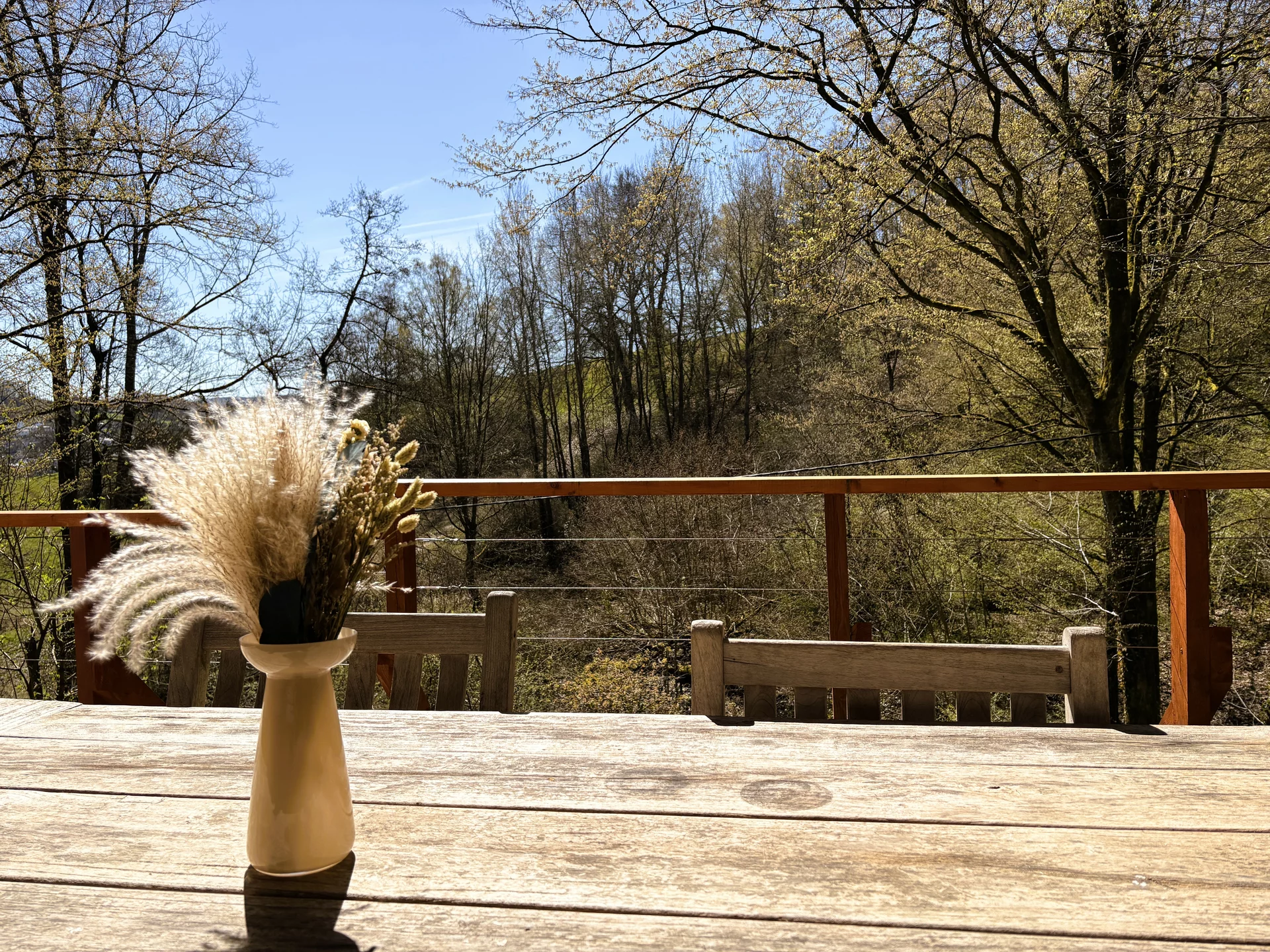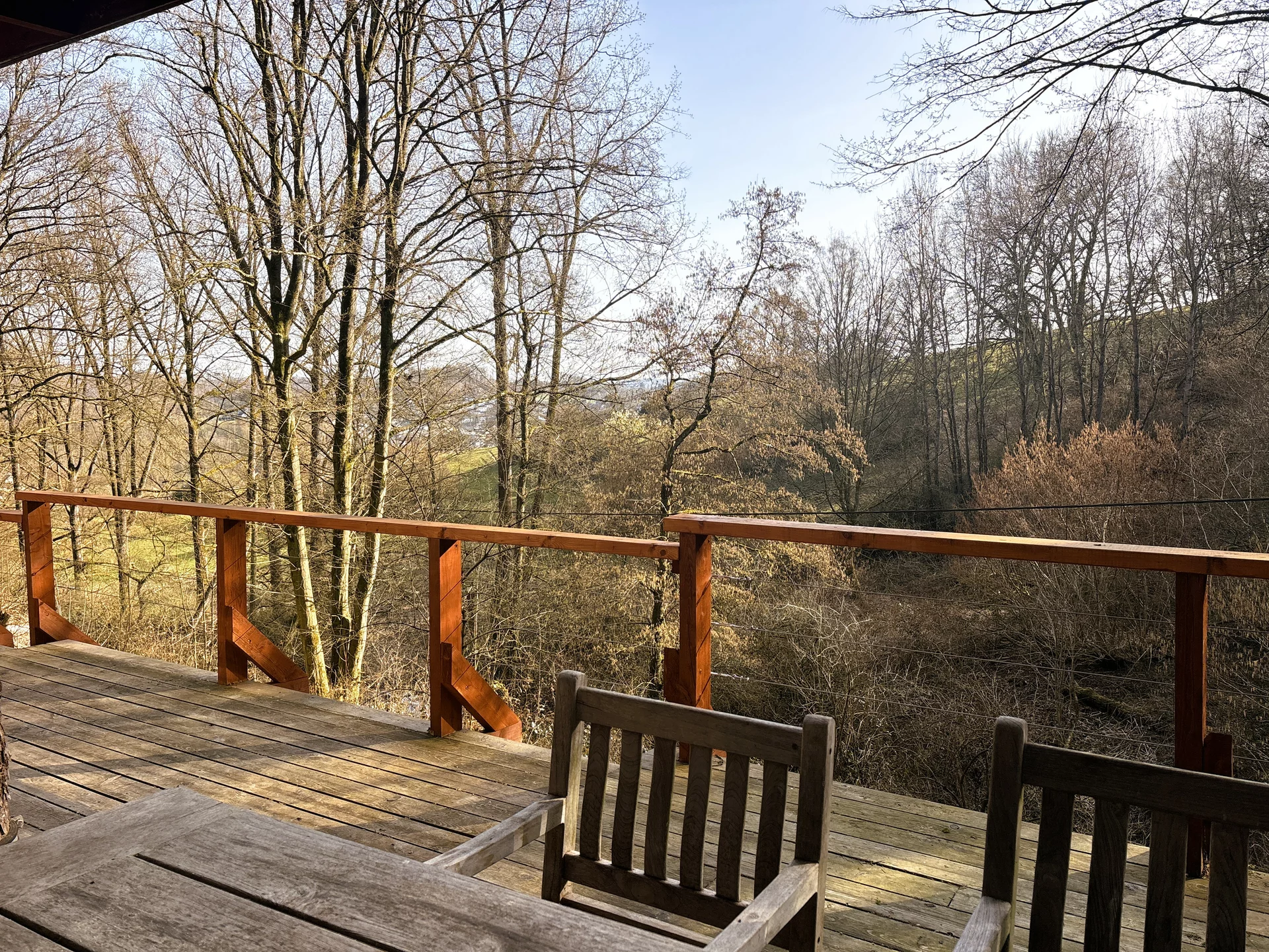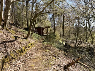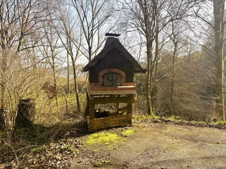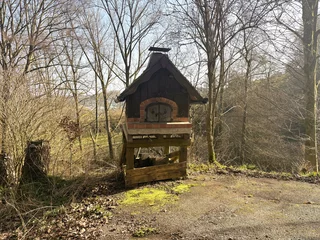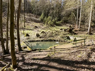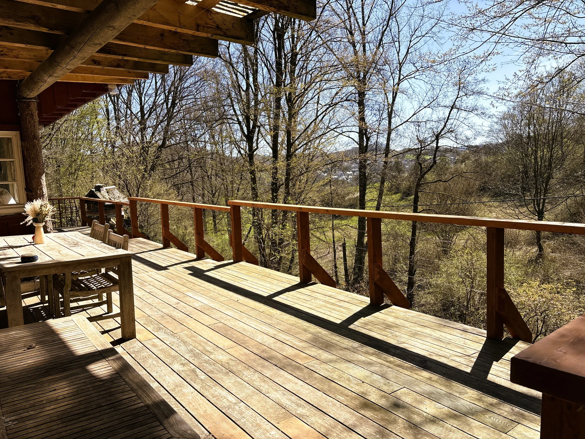 Der weitläufige Außenbereich bietet neben einem Wäldchen als Gartenfläche eine großflächige Holzterrasse mit Sitzgelegenheit und ausreichend Platz zum Grillen. Über das Grundstück fließt ein Bach mit einem kleinen Teich. Das Grundstück ist mit normalen PKW erreichbar (Zufahrt über einen Waldweg, keine tiefergelegten Sportwagen) und ihr könnt direkt an der Hütte parken.